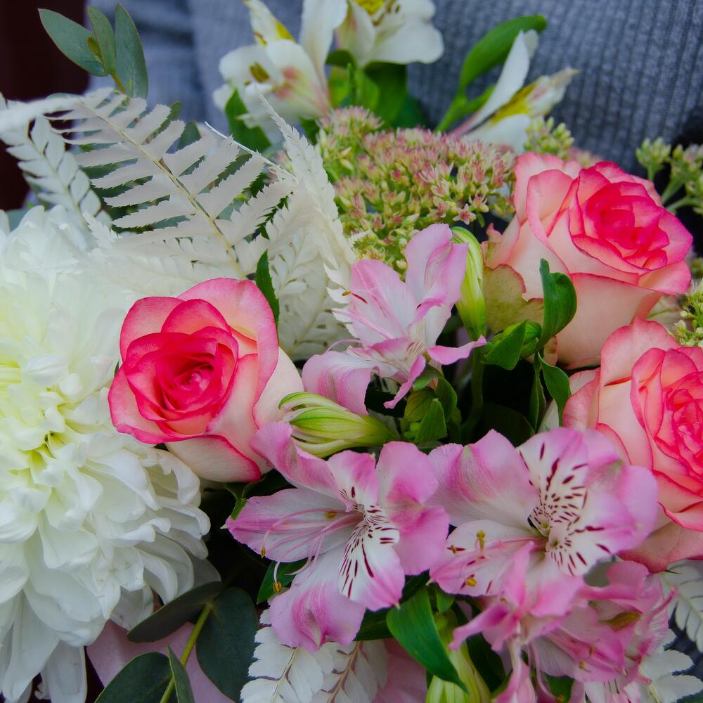 Роза – 3 шт. Альстромерия – 3 шт. Хризантема – 1 шт. Папоротник – 1 шт.