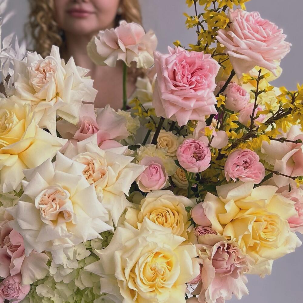 Гортензия – 2 шт.Роза – 19 шт.Кустовая роза – 7 шт.Сухоцветы – 9 шт.Шляпная коробка – 1 шт.Форзиция – 3 шт.