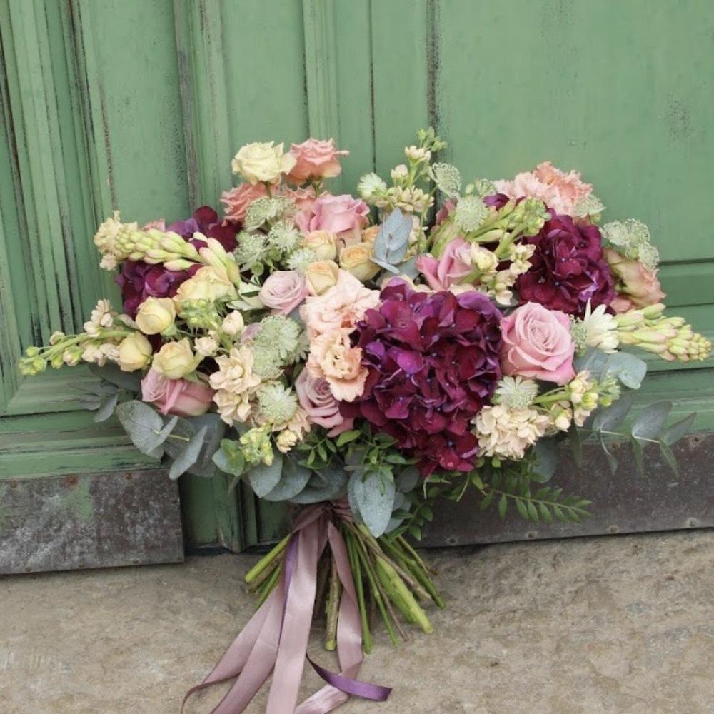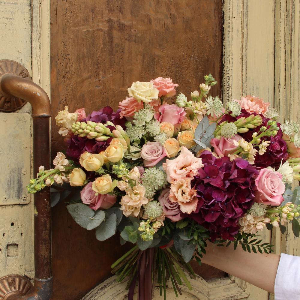 Раскидистый букет с гортензиями, эустомой, розами, маттиолой и эвкалиптом.Стильное цветочное решение для любого случая.Ширина букета около 60 сантиметров, высота букета около 60 сантиметров.