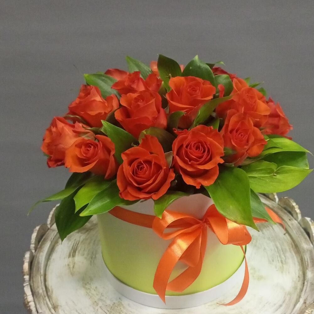 Роза – 17 шт.Зелень – 10 шт.Коробка шляпная – 1 шт.Оазис флористический – 1 шт.