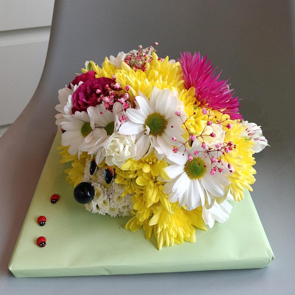 Хризантема кустовая – 6 шт.Роза кустовая – 1 шт.Гербера – 1 шт.Гипсофила – 1 шт.Альстромерия – 1 шт.Декор – 1 шт.Оазис флористический – 1 шт.Подставка – 1 шт.