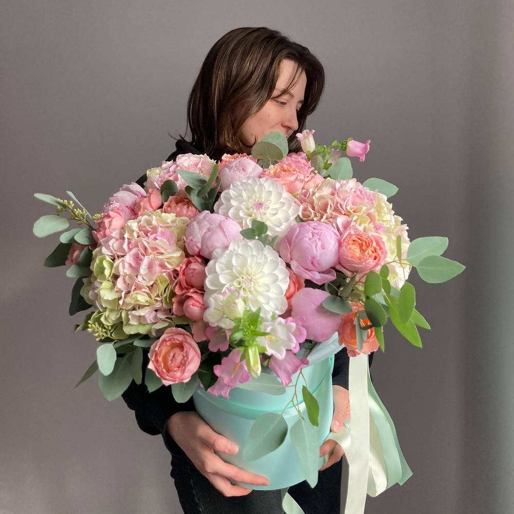 Гортензия – 3 шт.Роза кустовая пионовидная – 7 шт.Роза пионовидная – 5 шт.Колокольчик – 5 шт.Георгина – 3 шт.Эвкалипт – 5 шт.Шляпная коробка – 1 шт.Лента атласная – 2 шт.Тишью – 2 шт.Оазис флористический – 2 шт.