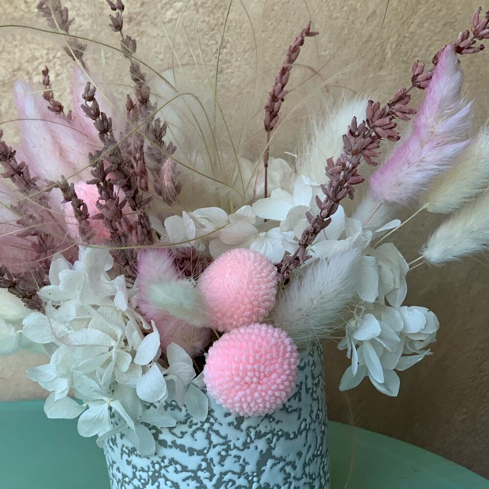 сухоцветы микс – 20 шт.керамическое кашпо ручной работы – 1 шт.Краспедия – 2 шт.Лаванда (сухоцвет) – 10 шт.гортензия стабилизированная – 1 шт.